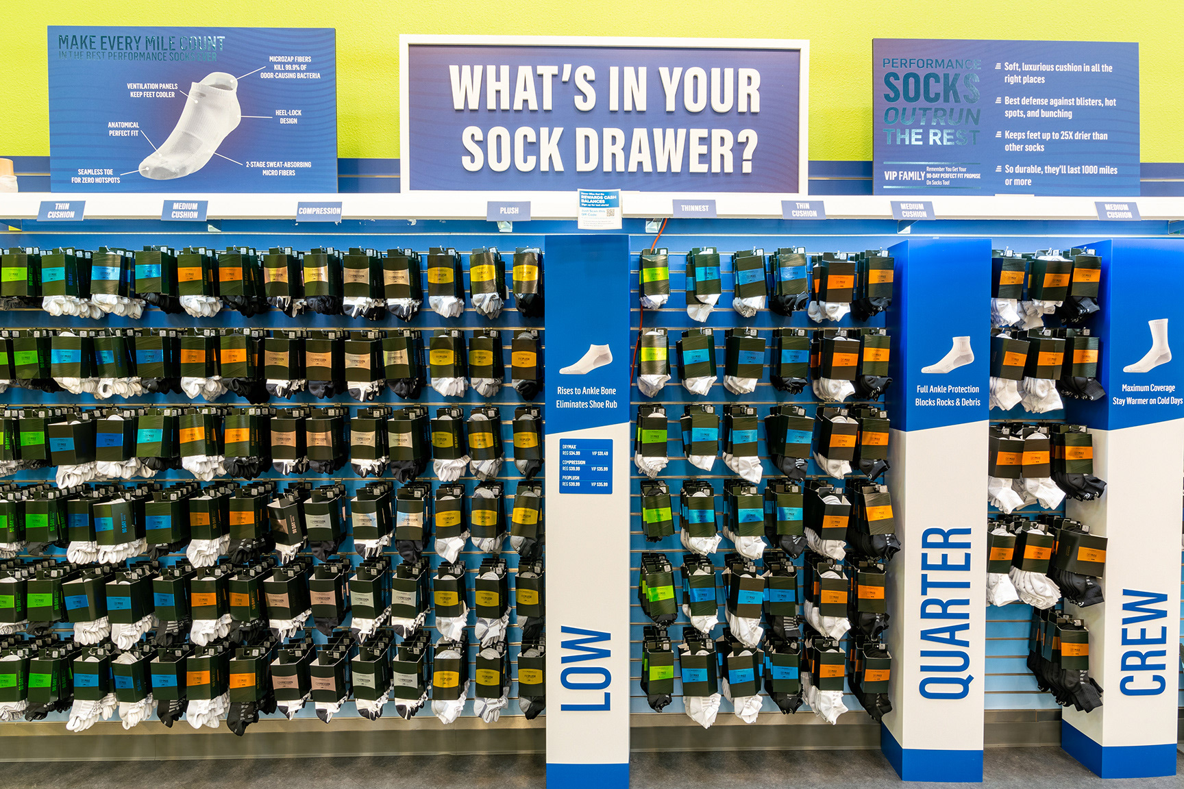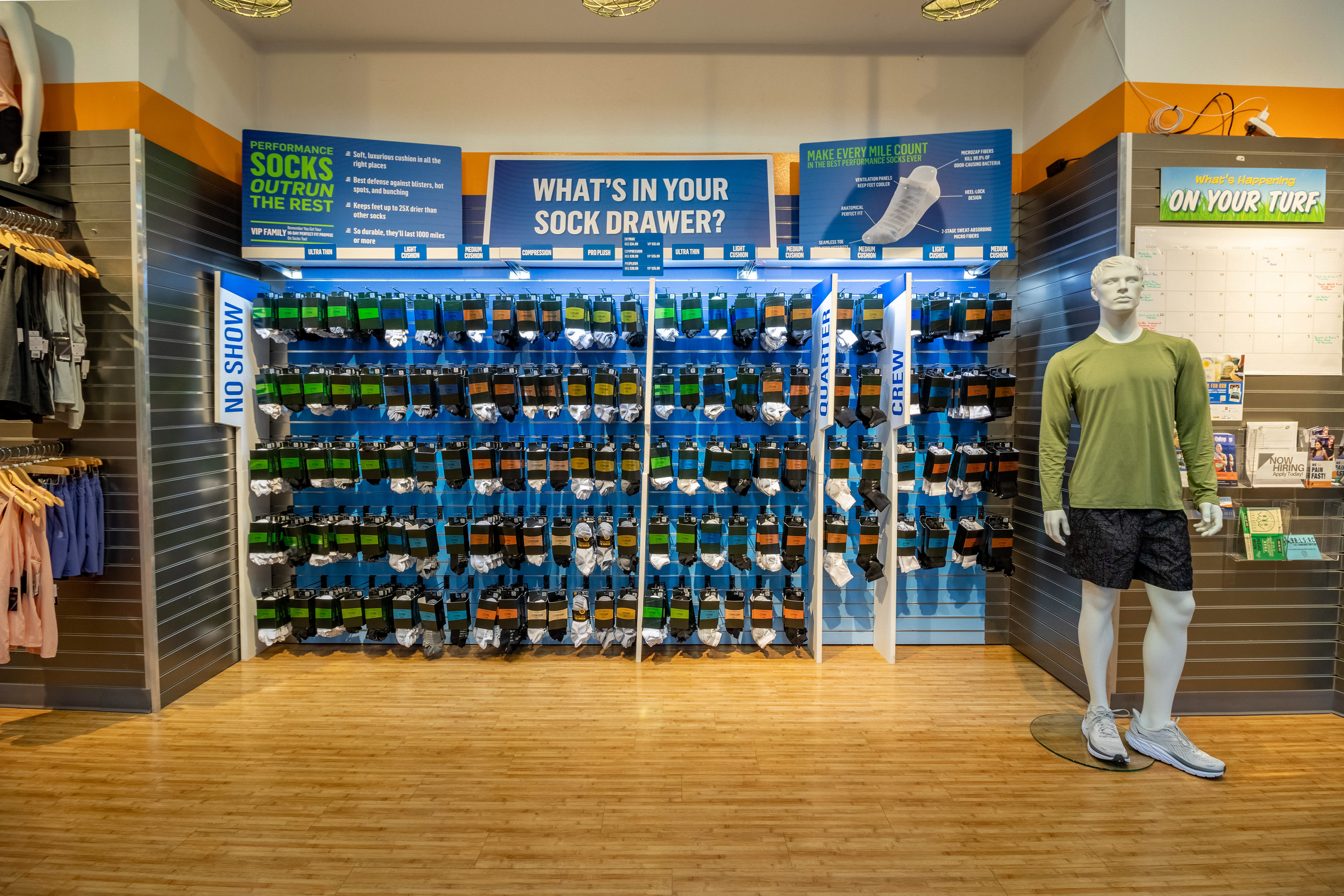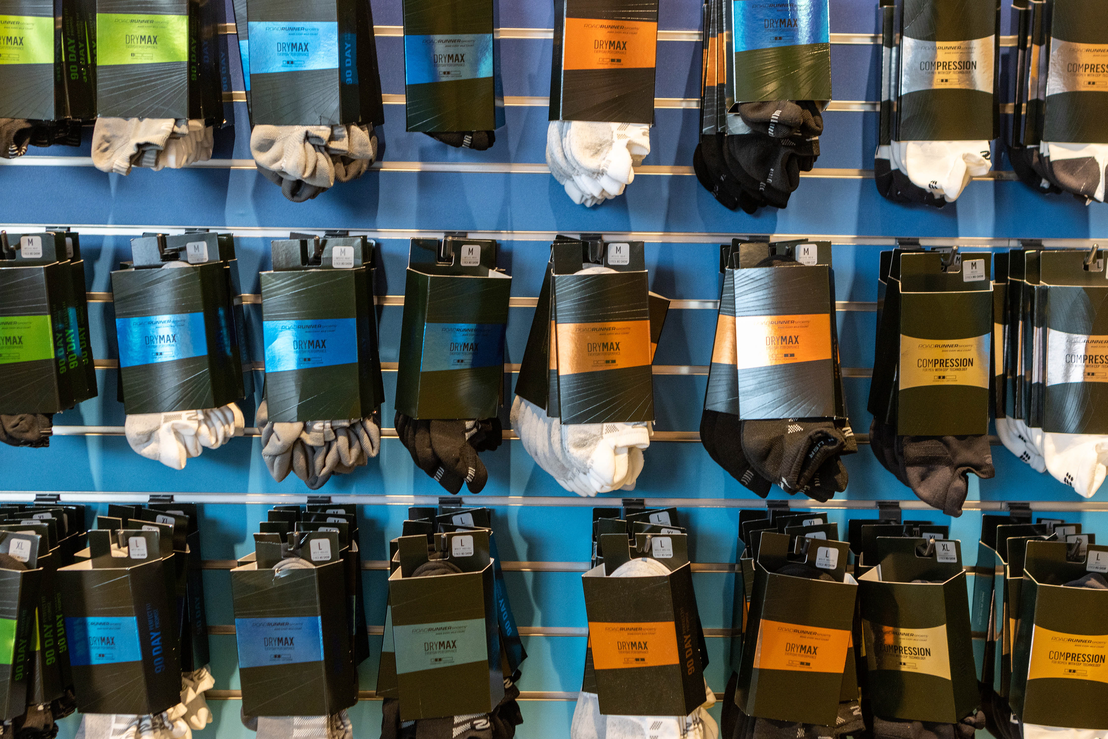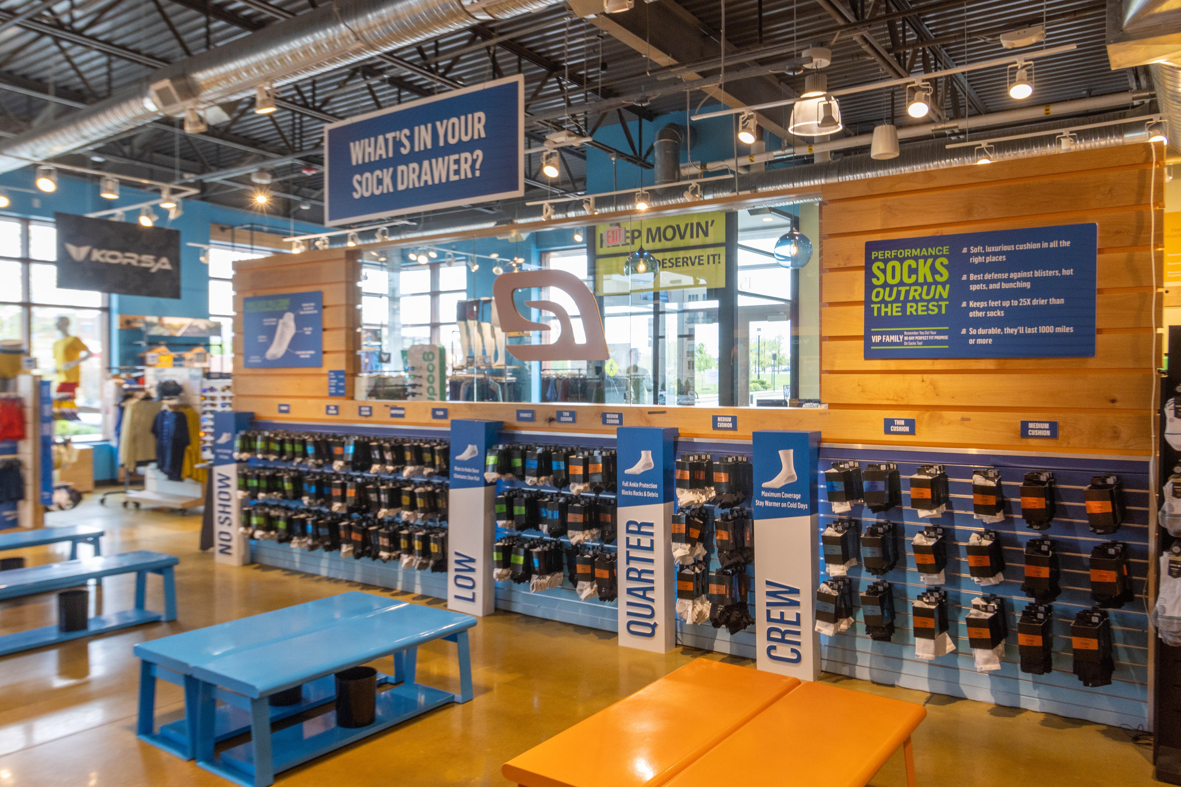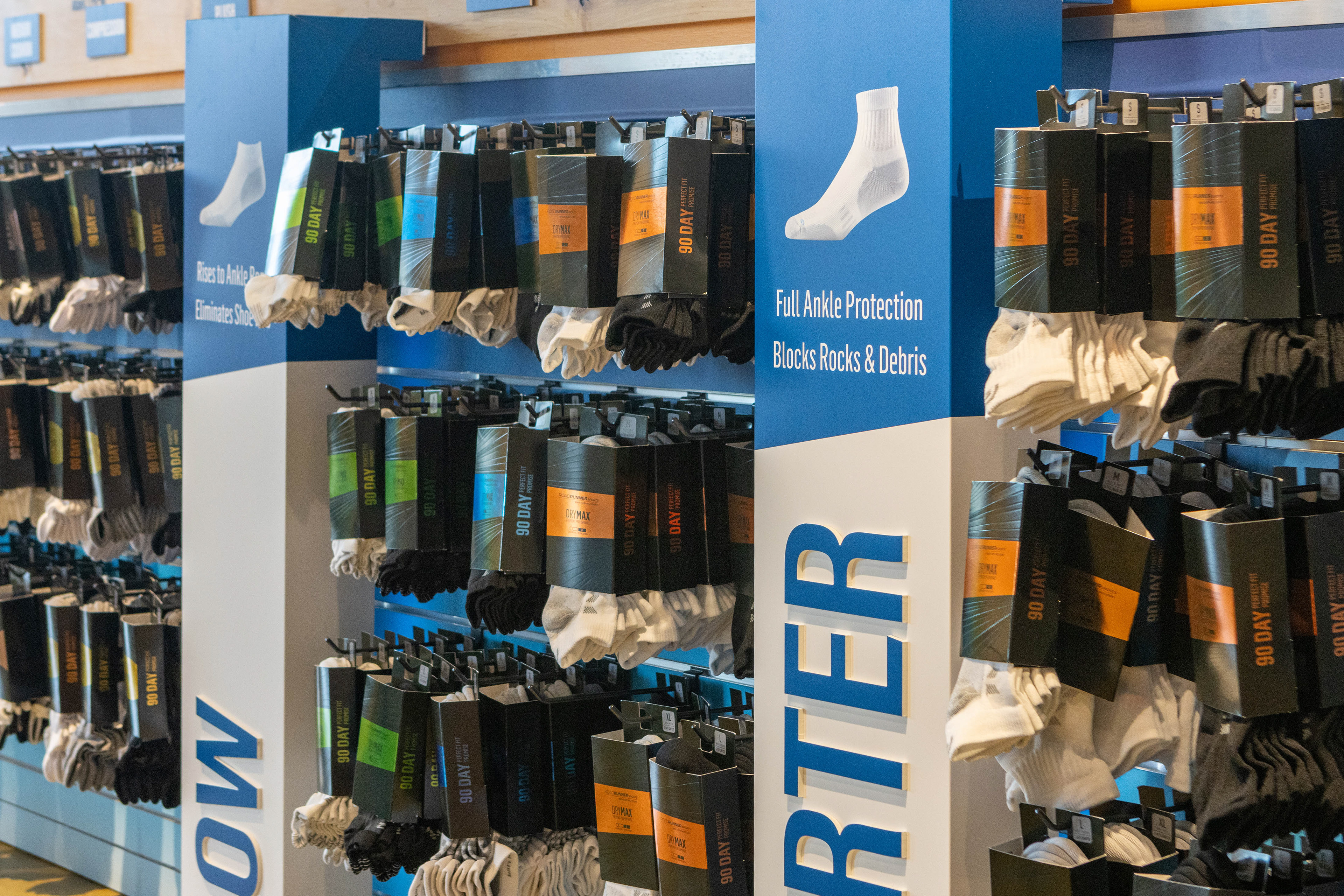 Packaging design for Road Runner Sports in-house sock line. Including die-line creation, in-store display, and in-store signage.